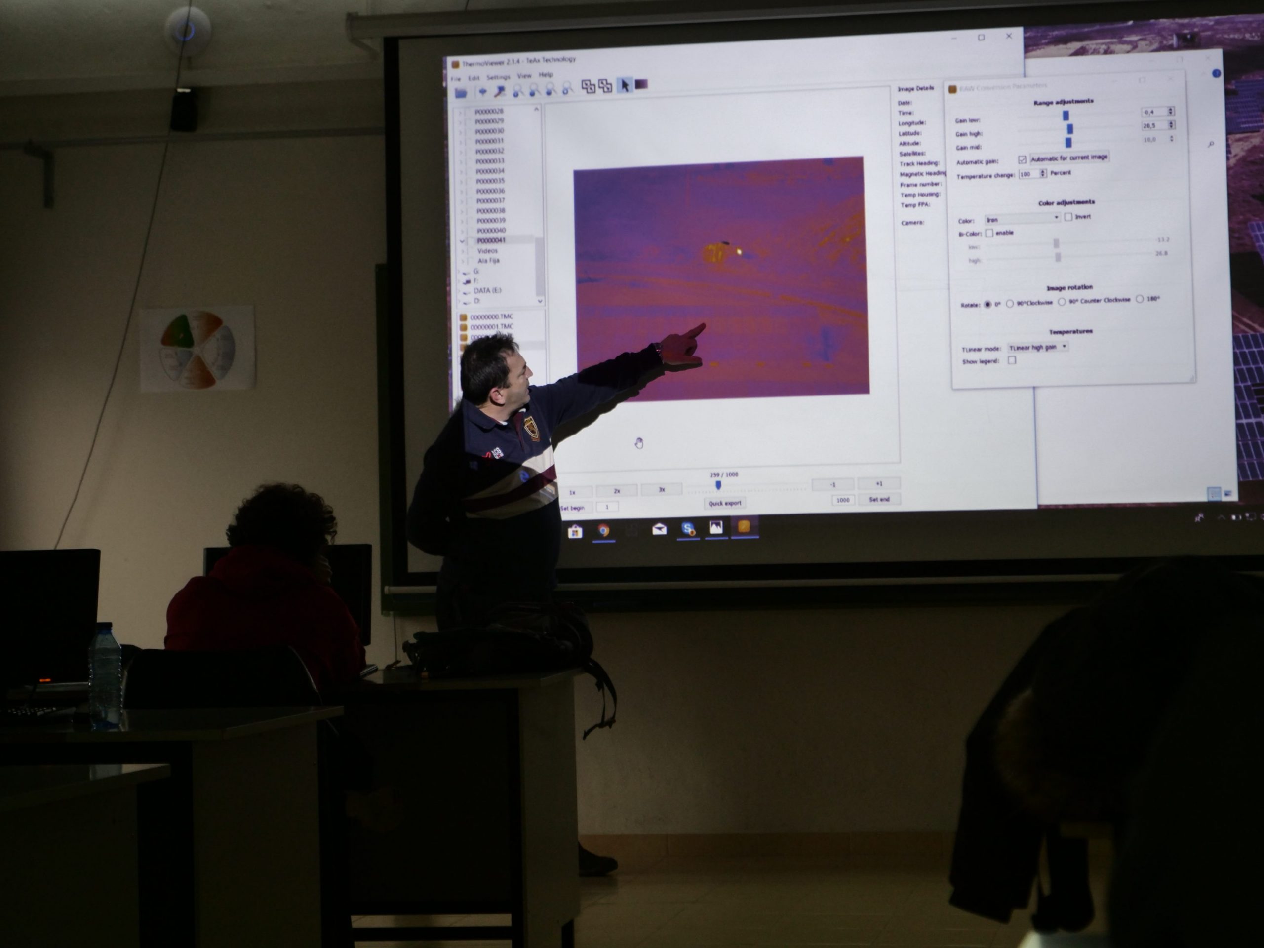 Una vez en el aula, procedimos con la descarga de las imágenes recogidas. Utilizando un software adecuado para termografía, fuimos explicando los resultados que habíamos obtenido.